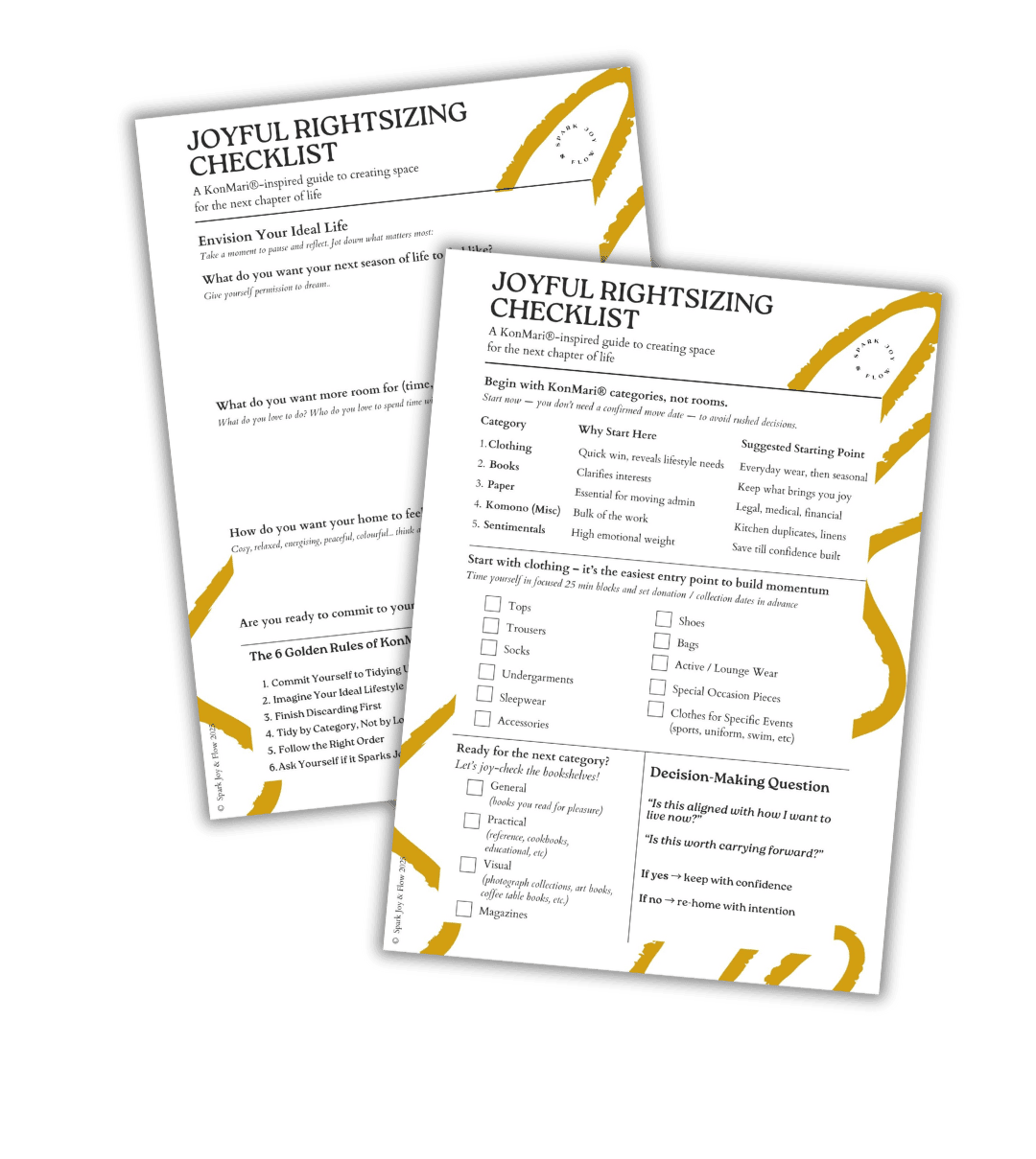 I’m Rebecca Jo-Rushdy - a Master KonMari® Consultant and certified End-of-Life Doula who helps individuals and families declutter with compassion, clarity, and joy. This worksheet is a gentle starting point drawn from my Joyful Legacy and Rightsizing work.
